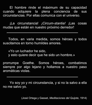 En «El hombre y su circunstancia», Ortega y Gasset “nos recuerda que en estos tiempos no alcanza con una ética que determine si nos encontramos actuando bien o mal de acuerdo a parámetros abstractos y generales. En todo caso, de lo que se trata es de medirse cada cual consigo mismo y de exigirse desde la propia libertad y decisión lo que nadie exige externamente: el anhelo y empeño por alcanzar la propia perfección.” (Mora Perpere Viñuales; «Vida heroica y fidelidad a uno mismo: Una lectura desde el raciovitalismo orteguiano»; Revista de Filosofía de la Universidad de Costa Rica; Vol. 60 Núm. 157; 2021; pp. 21-29.)